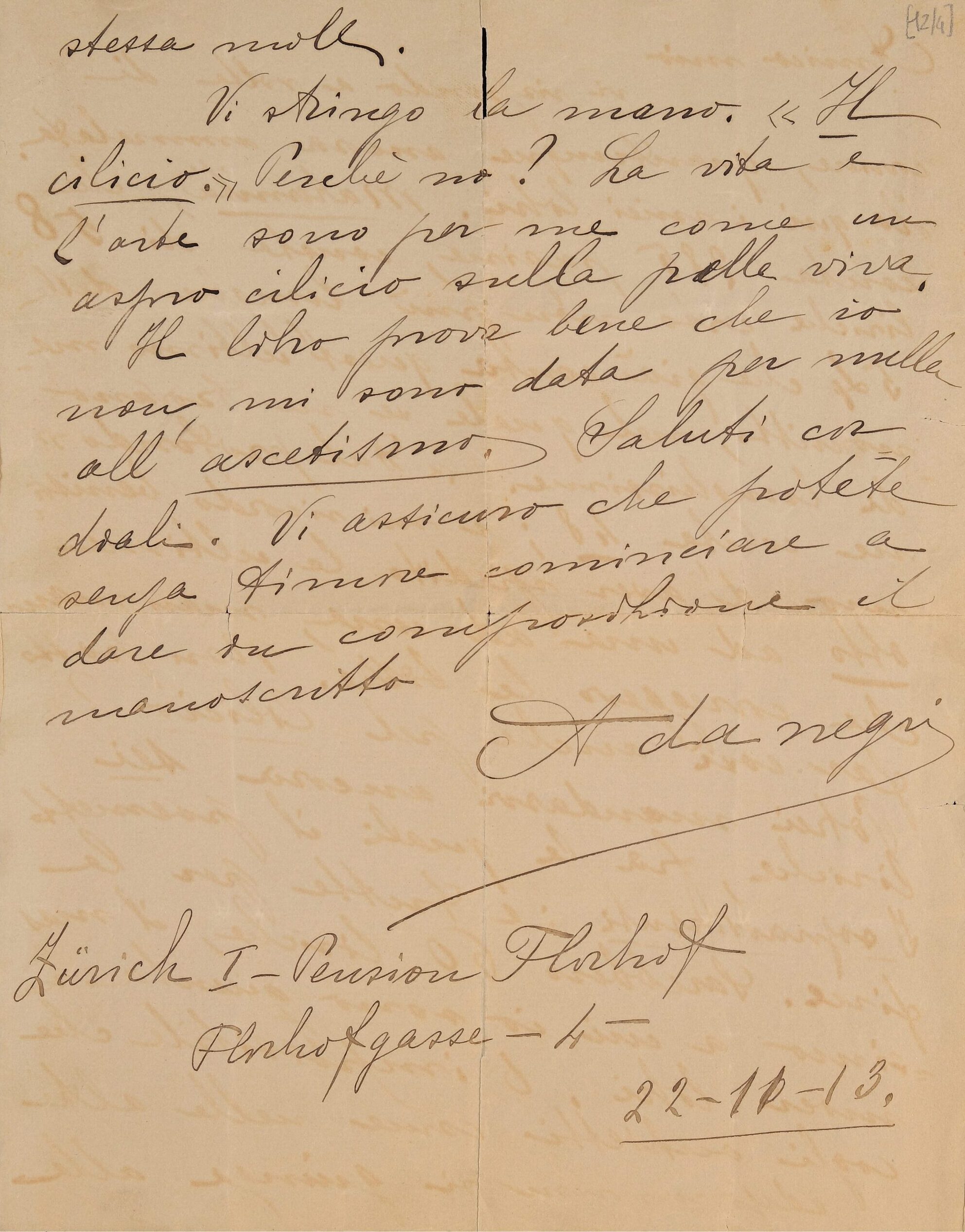 In un passo della lettera a Treves, la Negri afferma: «Il cilicio? Perché no? La vita e l’arte sono per me come un aspro cilicio sulla pelle viva. Il libro prova bene che io non mi sono data per nulla all’ascetismo!».
